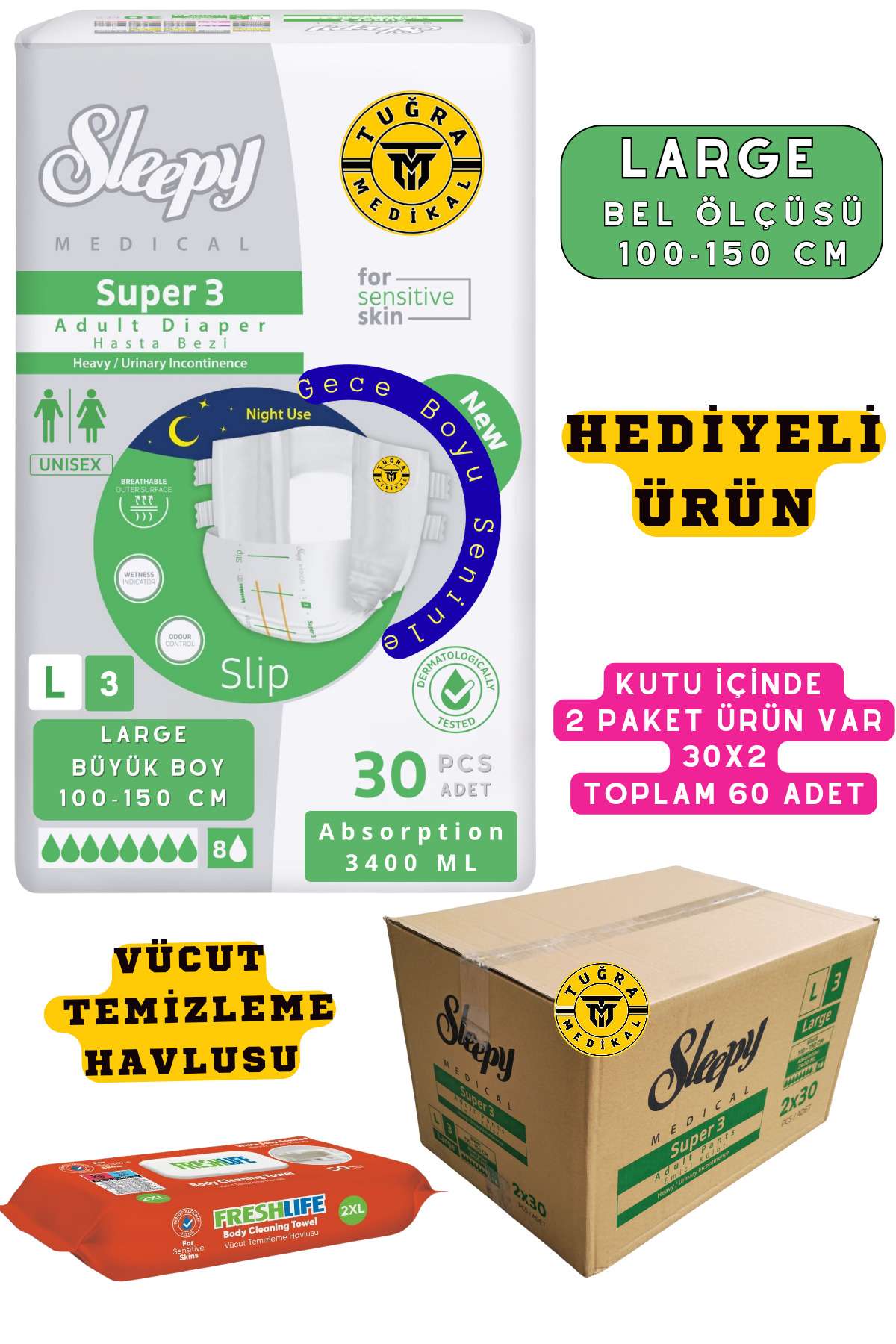 Belbantlı Yetişkin Hasta Bezi Unısex Süper 3 Gece Bezi | LARGE (L) 60 Adet 30X2 (HEDİYELİ)