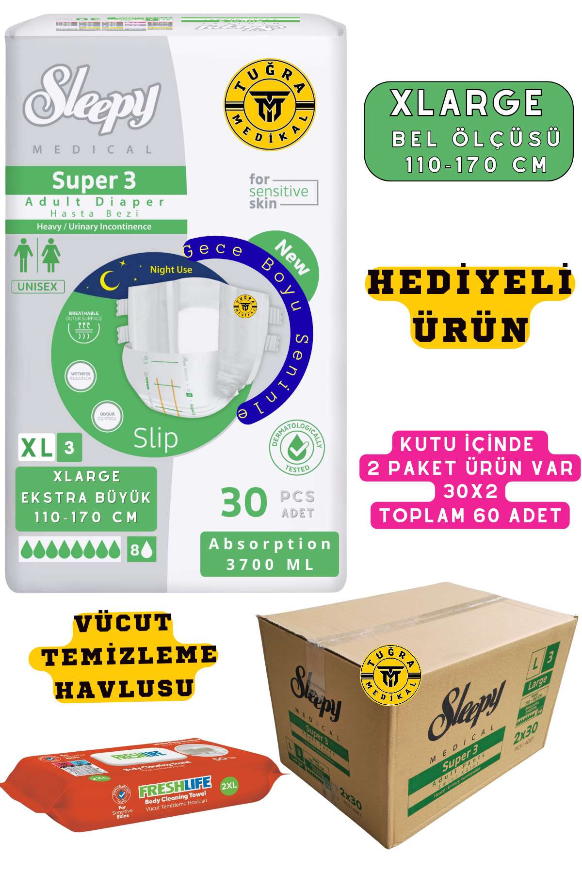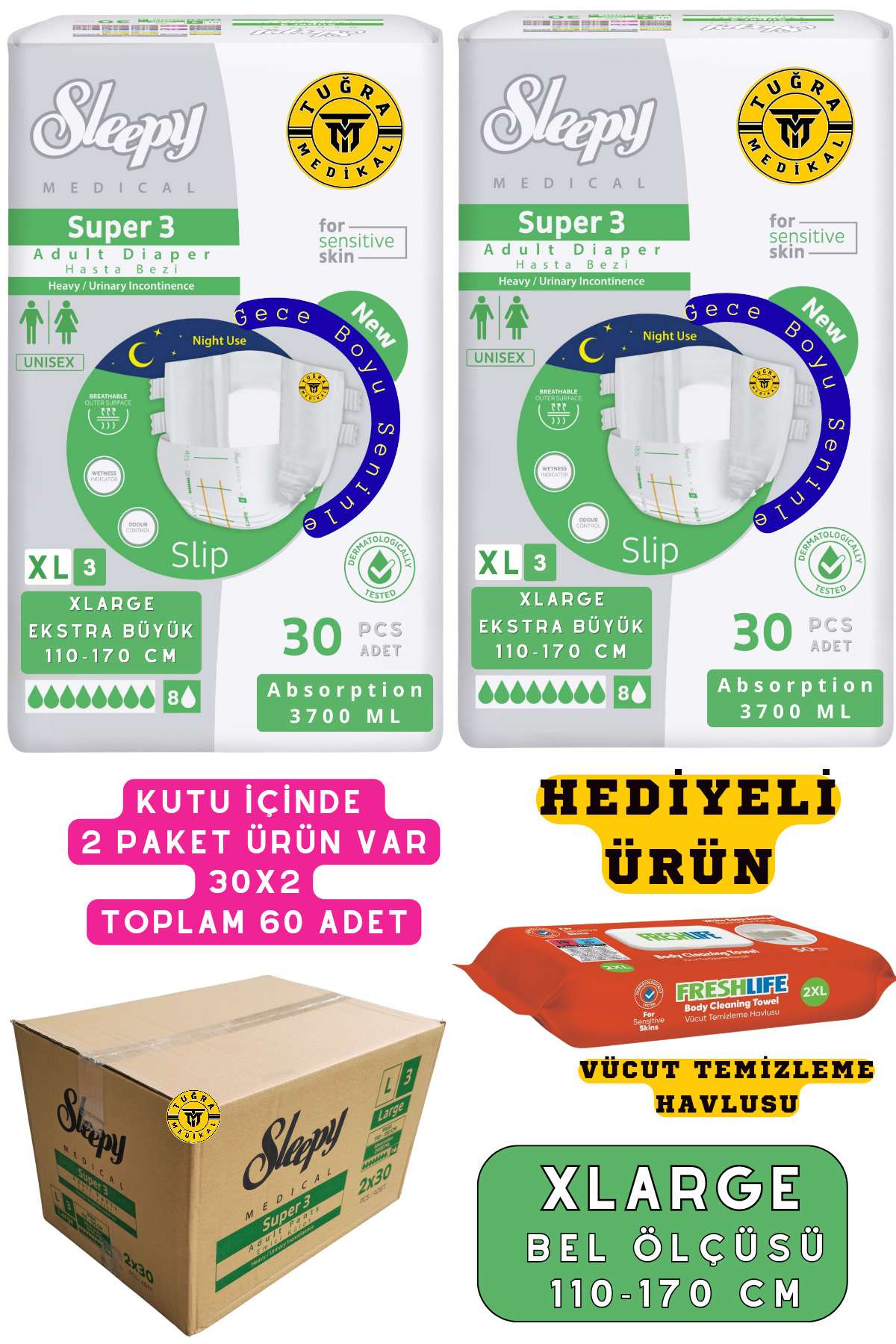 Belbantlı Yetişkin Hasta Bezi Unısex Süper 3 Gece Bezi | XLARGE (XL) 60 Adet 30X2 (HEDİYELİ)