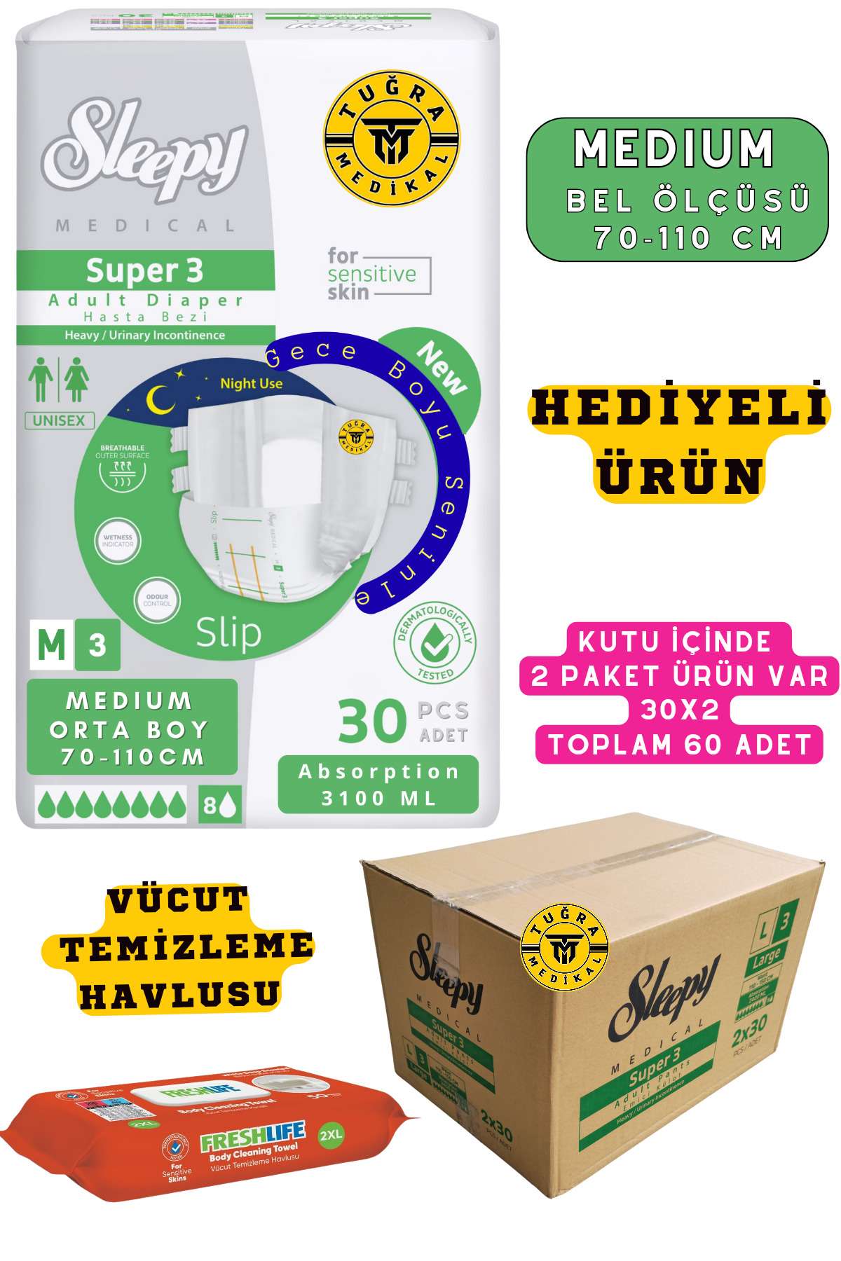 Belbantlı Yetişkin Hasta Bezi Unısex Süper 3 Gece Bezi | MEDIUM (M) 60 Adet 30X2 (HEDİYELİ)