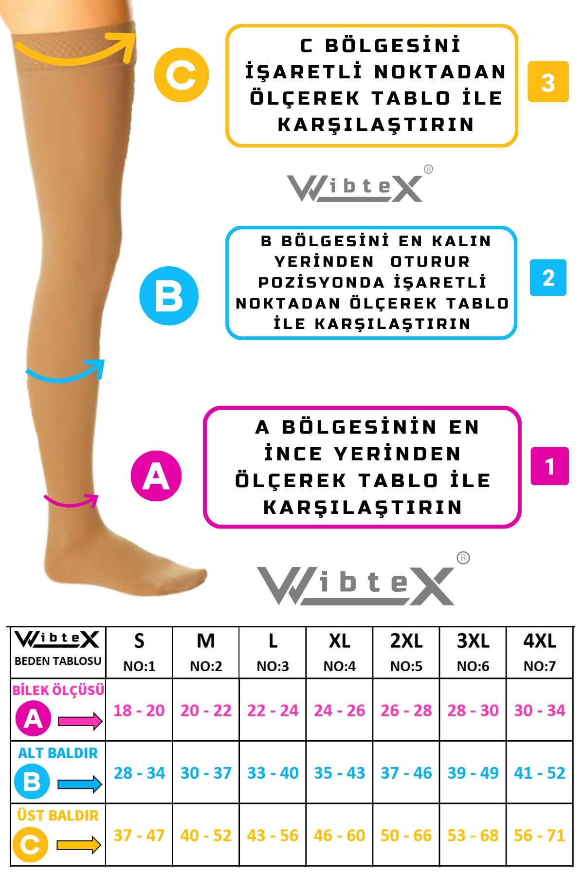 Varis çorapları erkek ve bayanlar için ortaklaşa olarak tasarlanmıştır; Tedavinin etkisi ve devamlılığı için doğru ölçüdeki çorabını kullanmanız gerekmektedir; İleri derece varislerde ilerlemeyi önler ve tedaviye yardımcı olur; Uyguladığı dereceli basınç sayesinde kanın tek bir noktada birikmesini engelleyerek kan dolaşımının hızlanmasına yardımcı olur; Bacaklardaki yorgunluk hissini azaltır; Uzun yolculuklarda kullanıldığında ödemi engelleyen,unisex rahatlatıcı çoraptır; Gün içinde ayakta kaldığınız sürece çorabı ile dolaşılır; VARİS ÇORABI BEDEN SEÇİMİNİZİ YAPMADAN ÖNCE GEREKLİ BİLGİLER Ürün görselinde olan beden tablosundaki belirtilen bölgelerden ölçüm yapınız; Her iki bacaktan da ölçü alınmalı, not edilerek ürün görselinde bulunan beden tablosundan en uygun aralık seçilmelidir; (Sabah uyanınca alınan ölçü en doğru beden seçimini sağlar) VARİS ÇORAPLARINDA BEDEN NASIL BELİRLENİR 1; Ayak bileğinin en ince yerinden çevre ölçüsünü alın,ölçüm tablosunda A olarak gösterilir; (oturur vaziyette iken) 2; Alt baldırın en kalın yerinden çevre ölçüsünü alın,ölçüm tablosunda B olarak gösterilir; (oturur vaziyette iken) 3; Üst baldırın en kalın yerinden çevre ölçüsünü alın,ölçüm tablosunda c olarak gösterilir; (oturur vaziyette iken) VARİS ÇORABI KULLANIRKEN DİKKAT ETMENİZ GEREKENLER; Sabah uyandığınızda çorabınızı giymeden önce sırt üstü uzanıp ayaklarınızı yukarı 5 dakika kaldırın ve sonra giyin; Kirlenen çoraplarınızı asla çamaşır makinasına atmayın; Yıkamayı sadece elde çitilemeden ılık sabunlu su ve ile yapınız; Kurutma işlemini petek, sandalye çamaşır ipi gibi yerlere asmayınız; Düz bir zemine, havlu serip, havlu arasında oda ısısında kurutunuz; ; ;;