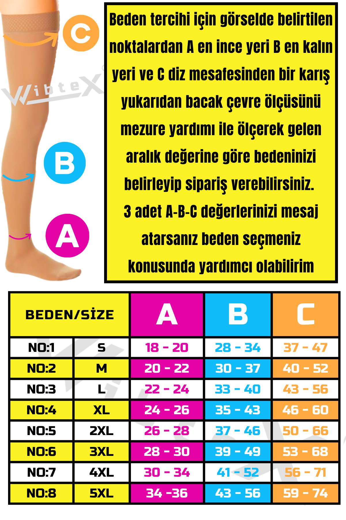 VARİS ÇORAPLARI ERKEK VE BAYANLAR İÇİN ORTAKLAŞA TASARLANMIŞTIR; Tedavinin etkisi ve devamlılığı için doğru ölçüdeki VARİS çorabını kullanmanız gerekmektedir; İleri derece varislerde ilerlemeyi önler ve tedaviye yardımcı olur; Uyguladığı dereceli basınç sayesinde kanın tek bir noktada birikmesini engelleyerek kan dolaşımının hızlanmasına yardımcı olur; Bacaklardaki yorgunluk hissini azaltır; Uzun yolculuklarda kullanıldığında ödemi engelleyen, rahatlatıcı çoraptır; Gün içinde ayakta kaldığınız sürece VARİS çorabı ile dolaşılır; VARİS ÇORABI BEDEN SEÇİMİNİZİ YAPMADAN ÖNCE GEREKLİ BİLGİLER Ürün görselinde olan beden tablosundaki belirtilen bölgelerden ölçüm yapınız; Her iki bacaktan da ölçü alınmalı, not edilerek ürün görselinde bulunan beden tablosundan en uygun aralık seçilmelidir; (Sabah uyanınca alınan ölçü en doğru beden seçimini sağlar) VARİS ÇORAPLARINDA BEDEN NASIL BELİRLENİR 1; Ayak bileğinin en ince yerinden çevre ölçüsünü alın, ölçüm tablosunda A olarak gösterilir; 2; Alt baldırın en kalın yerinden çevre ölçüsünü alın, ölçüm tablosunda B olarak gösterilir; 3; Üst baldırın en kalın yerinden çevre ölçüsünü alın,ölçüm tablosunda c olarak gösterilirVARİS ÇORABI KULLANIRKEN DİKKAT ETMENİZ GEREKENLER; Sabah uyandığınızda çorabınızı giymeden önce sırt üstü uzanıp ayaklarınızı yukarı 2 dakika kaldırın ve sonra giyin; Kirlenen çoraplarınızı asla çamaşır makinasına atmayın; Yıkamayı sadece elde çitilemeden ılık sabunlu su ve ile yapınız; Kurutma işlemini petek, sandalye çamaşır ipi gibi yerlere asmayınız; Düz bir zemine, havlu serip, havlu arasında oda ısısında kurutunuz;