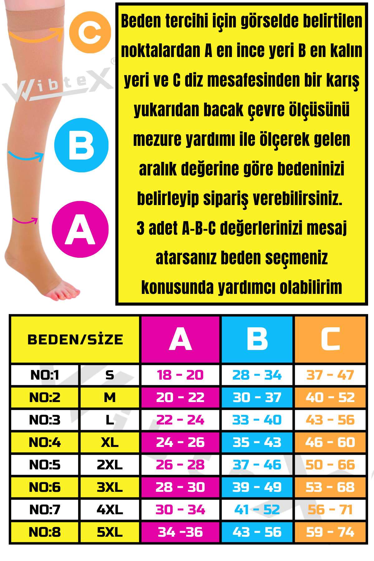 ÇORAPLARI ERKEK VE BAYANLAR İÇİN ORTAKLAŞA TASARLANMIŞTIR.; Tedavinin etkisi ve devamlılığı için doğru ölçüdeki çorabını kullanmanız gerekmektedir.; İleri derece lerde ilerlemeyi önler ve tedaviye yardımcı olur.; Uyguladığı dereceli basınç sayesinde kanın tek bir noktada birikmesini engelleyerek kan dolaşımının hızlanmasına yardımcı olur.; Bacaklardaki yorgunluk hissini azaltır.; Uzun yolculuklarda kullanıldığında ödemi engelleyen, rahatlatıcı çoraptır.; Gün içinde ayakta kaldığınız sürece çorabı ile dolaşılır.; ÇORABI BEDEN SEÇİMİNİZİ YAPMADAN ÖNCE GEREKLİ BİLGİLER Ürün görselinde olan beden tablosundaki belirtilen bölgelerden ölçüm yapınız.; Her iki bacaktan da ölçü alınmalı, not edilerek ürün görselinde bulunan beden tablosundan en uygun aralık seçilmelidir.; (Sabah uyanınca alınan ölçü en doğru beden seçimini sağlar) ÇORAPLARINDA BEDEN NASIL BELİRLENİR 1. Ayak bileğinin en ince yerinden çevre ölçüsünü alın, ölçüm tablosunda A olarak gösterilir.; 2. Alt baldırın en kalın yerinden çevre ölçüsünü alın, ölçüm tablosunda B olarak gösterilir.; 3. Üst baldırın en kalın yerinden çevre ölçüsünü alın,ölçüm tablosunda c olarak gösterilir ÇORABI KULLANIRKEN DİKKAT ETMENİZ GEREKENLER *Sabah uyandığınızda çorabınızı giymeden önce sırt üstü uzanıp ayaklarınızı yukarı 2 dakika kaldırın ve sonra giyin.; *Kirlenen çoraplarınızı asla çamaşır makinasına atmayın.; *Yıkamayı sadece elde çitilemeden ılık sabunlu su ve ile yapınız.; *Kurutma işlemini petek, sandalye çamaşır ipi gibi yerlere asmayınız.; *Düz bir zemine, havlu serip, havlu arasında oda ısısında kurutunuz.