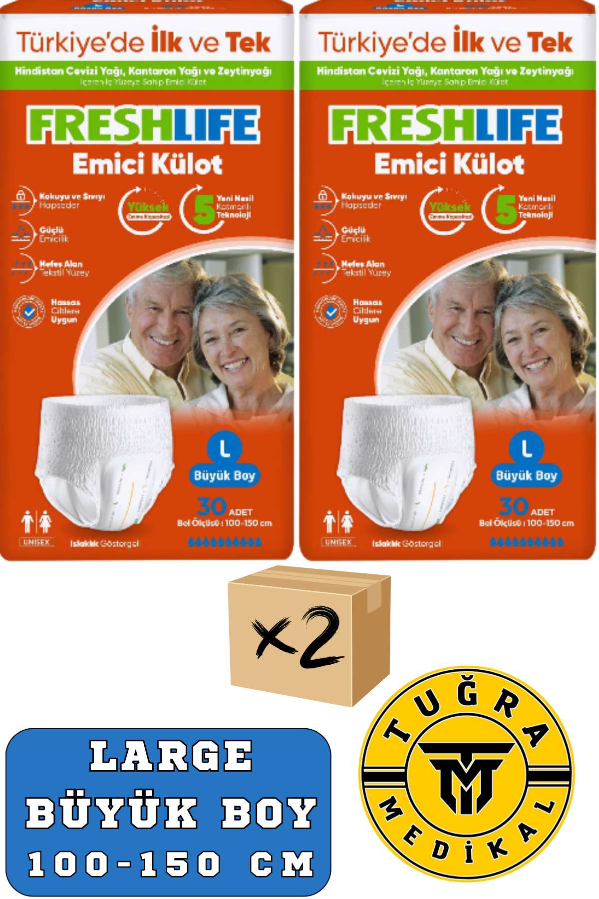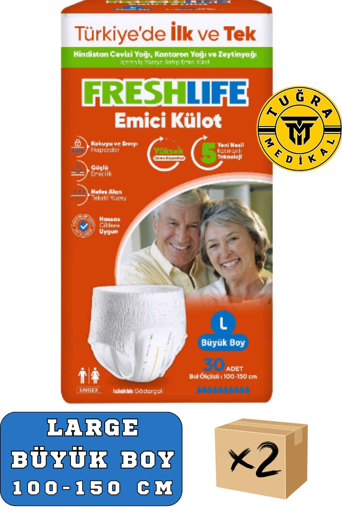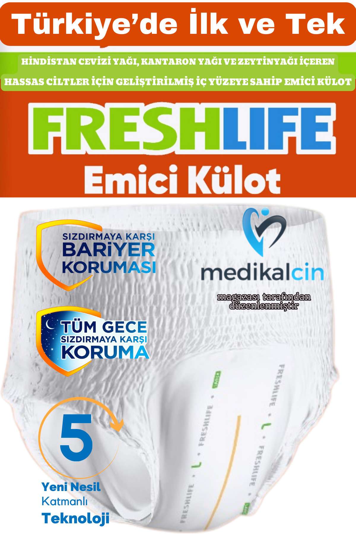 – Yetişkinler için özel olarak tasarlanmış, konforlu ve pratik bir kullanım sunar.; – Yüksek emicilik özelliği sayesinde uzun süreli kullanımda bile maksimum kuruluk sağlar.; – Tek beden seçeneği ile her bedene uygun, rahat bir oturuş sunar.; – Türkiye’de üretilmiş olup, yerel kaynaklı ve kaliteli malzemelerden üretilmiştir.; – 60 adetlik 2 paket avantajıyla uzun süreli ihtiyaçlarınızı karşılar.; – Geniş beden seçeneği ile her vücut tipine uygun konfor sunar.; – Yetişkin kullanıcılar için özel olarak tasarlanmış, günlük kullanım için idealdir.; – Emici özelliği sayesinde gün boyu kuru ve ferah bir his sağlar.; – Tek ebat seçeneğiyle pratik kullanım imkanı sunar; farklı bedenlere uyum sağlar.; – 60 adetlik 2 paket avantajıyla uzun süreli kullanım için ekonomik bir seçenektir.; -FRESHLIFE yetişkinemici külot, hem konfor hem de koruma arayan bireyler için özel olaraktasarlanmıştır.; Yüksek emme kapasitesi sayesinde, gün boyu güvenli ve kurukalmanızı sağlar.; HİNDİSTANCEVİZİ YAĞI, KANTARONYAĞIVE ZEYTİNYAĞIİÇEREN, HASSAS CİLTLERİÇİN GELİŞTİRİLMİŞİÇ YÜZEYE SAHİP EMİCİ KÜLOTÖzellikleri:Yüksek Emme Kapasitesi:İleri teknoloji ile üretilmiş emici katmanları, sıvıyı hızla hapseder ve sızıntıyı önler.; Kokuyu ve Sıvıyı Hapseder.; Yumuşak ve Nefes Alabilir Malzeme:Pamuklu iç yüzey, cildinize nazik davranırken, dış tabakası su geçirmez özellikte olup, ekstra koruma sağlar.; Elastik Bel Bandı:Rahat bir oturuş sunar ve kayma yapmadan güvenli bir şekilde vücudunuza uyum sağlar.; Farklı Beden Seçenekleri:Her bedene uygun seçenekler ile rahat ve kişisel bir deneyim sunar.; Hafif ve İnce Tasarım:Günlük giyimde rahatlık sağlar, dışarıdan görünümü doğal tutar.; Islaklık göstergeli.; Bu emicikülotlar, günlük yaşamınızda güvenliği ve konforu bir arada sunar.; İster evdeister dışarıda olun, kendinizi her zaman güvende hissetmenizi sağlar.